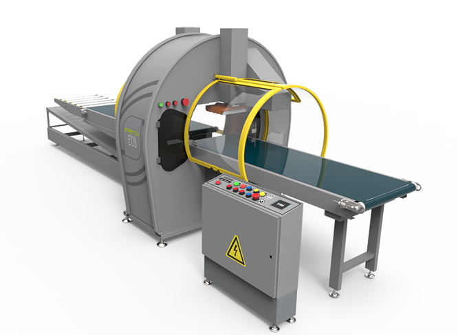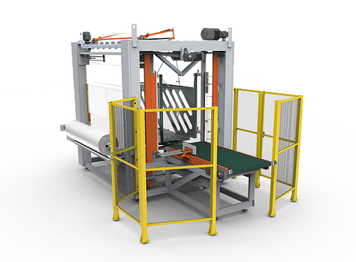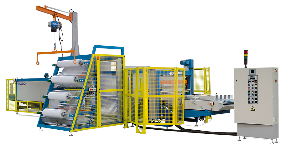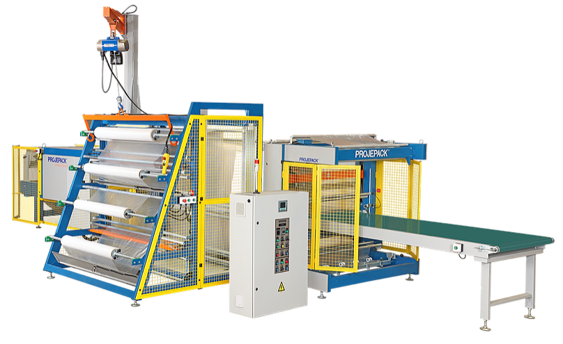 Máquina para produtividade máxima, tem como diferencial o ganho de produtividade e economia de energia, pois opera sem parada da esteira para corte e solda do filme plástico. É ideal para embalagem de peças leves, possui talha elétrica para abastecimento de bobinas e emenda automática para troca de filme.